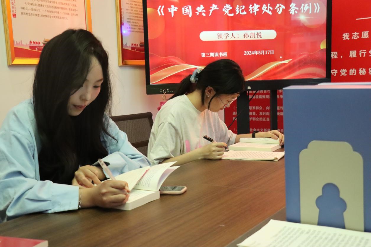 为深入贯彻落实党的二十大精神,进一步教育和引导学生干部学纪、知纪、明纪、守纪,推进党纪学习教育走深走实,5月17日,beat365官方网站在诚园4号楼210党团活动室开展了第三期党纪学习教育读书班活动,领学人孙凯悦和靳奉钰带领党员和入党积极分子进行学习。