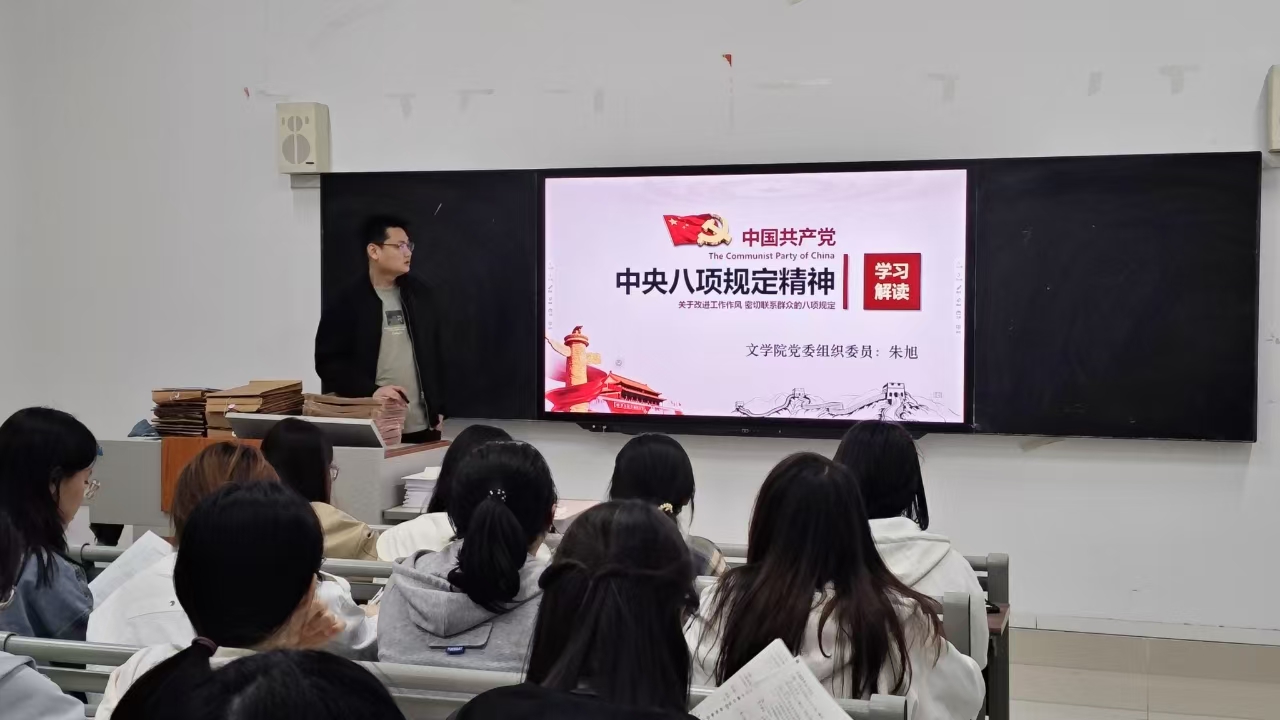为深入贯彻中央八项规定精神,进一步加强全院作风建设和纪律教育,4月22日,beat365官方网站党委组织委员朱旭在德艺楼7102室为全院各班学生干部69名同学讲授了题为“中央八项规定精神学习解读”的专题党课。