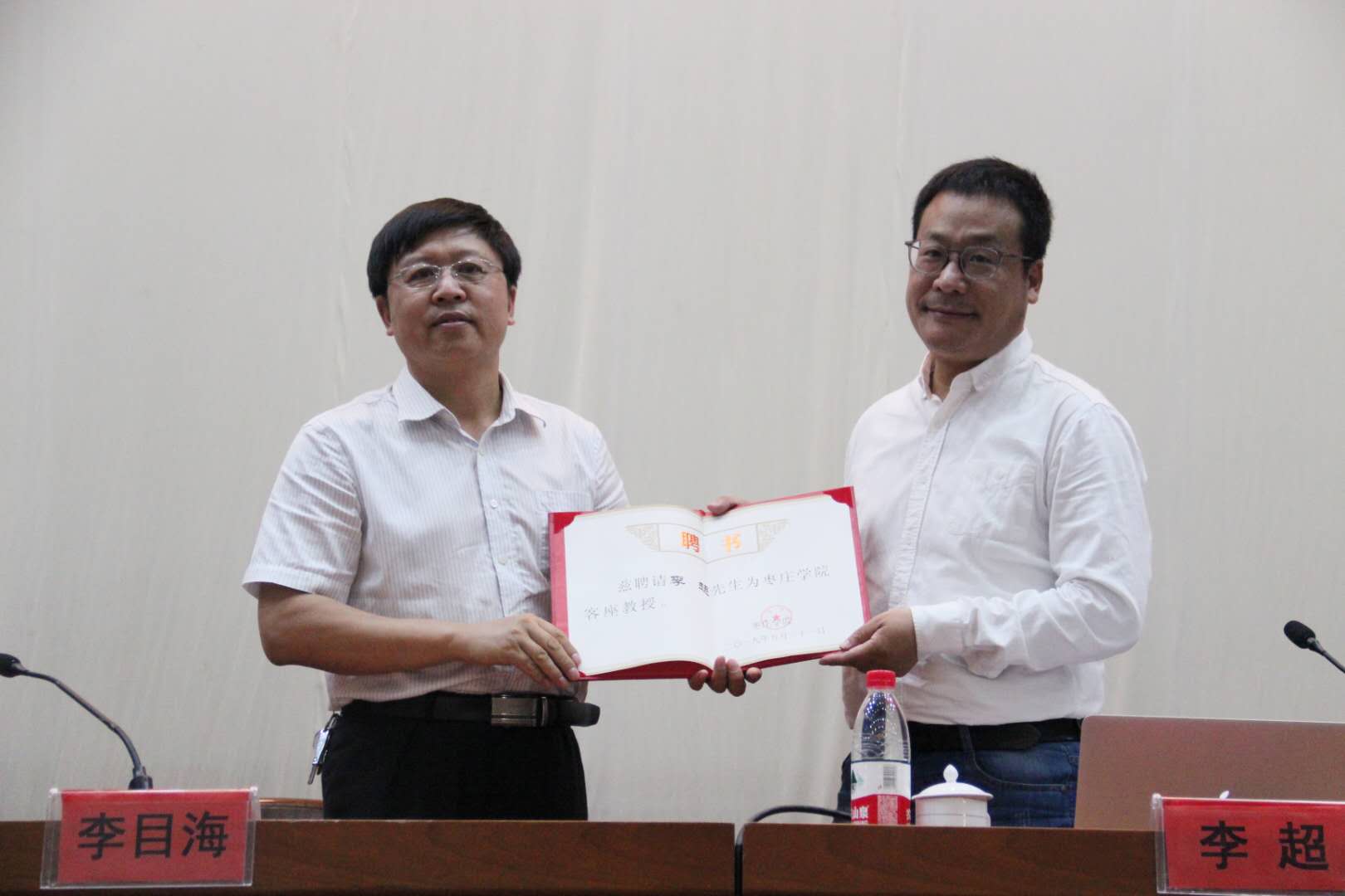 在报告会上,李目海为李超颁发客座教授聘书。其后,山东师范大学新闻与传媒学院教师、中国齐鲁文化促进会文学部副主任李超老师作了题为《创意思维与认知提升》的学术报告。作为山东省首批签约文艺评论家、山东电影审查委员会委员、山东省广电局特邀调研专家,李超老师长期从事影视艺术及其产业化研究,为十余部影视作品担任文学策划,其策划并主演的电影《大火种》获得2017年山东省精品文艺工程奖,策划的多项影视节目和影视剧被评为山东省广电局重点影视产业项目。他的报告,讲解深入独到,既充满真知灼见,又饱含艺术实践经验;他以生活中、影视艺术中鲜活的案例,深入阐发了创意、创意思维及自我认知,并勉励同学们要好好认识自我,好好提升自我,好好规划自我,好好成就自我。