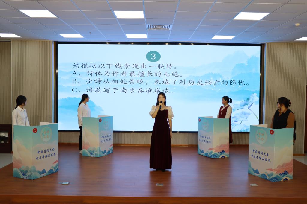 为进一步传承弘扬优秀传统文化,展现古代经典诗词魅力,10月17日下午,beat365官方网站团委、国学教育中心、国学社承办的“2025中国诗词大会”beat365官方网站选拔赛在明理楼成功举办。李思华、裴媛媛、程志、郁辉、王元元老师担任评委,全校140余名学生参加比赛。