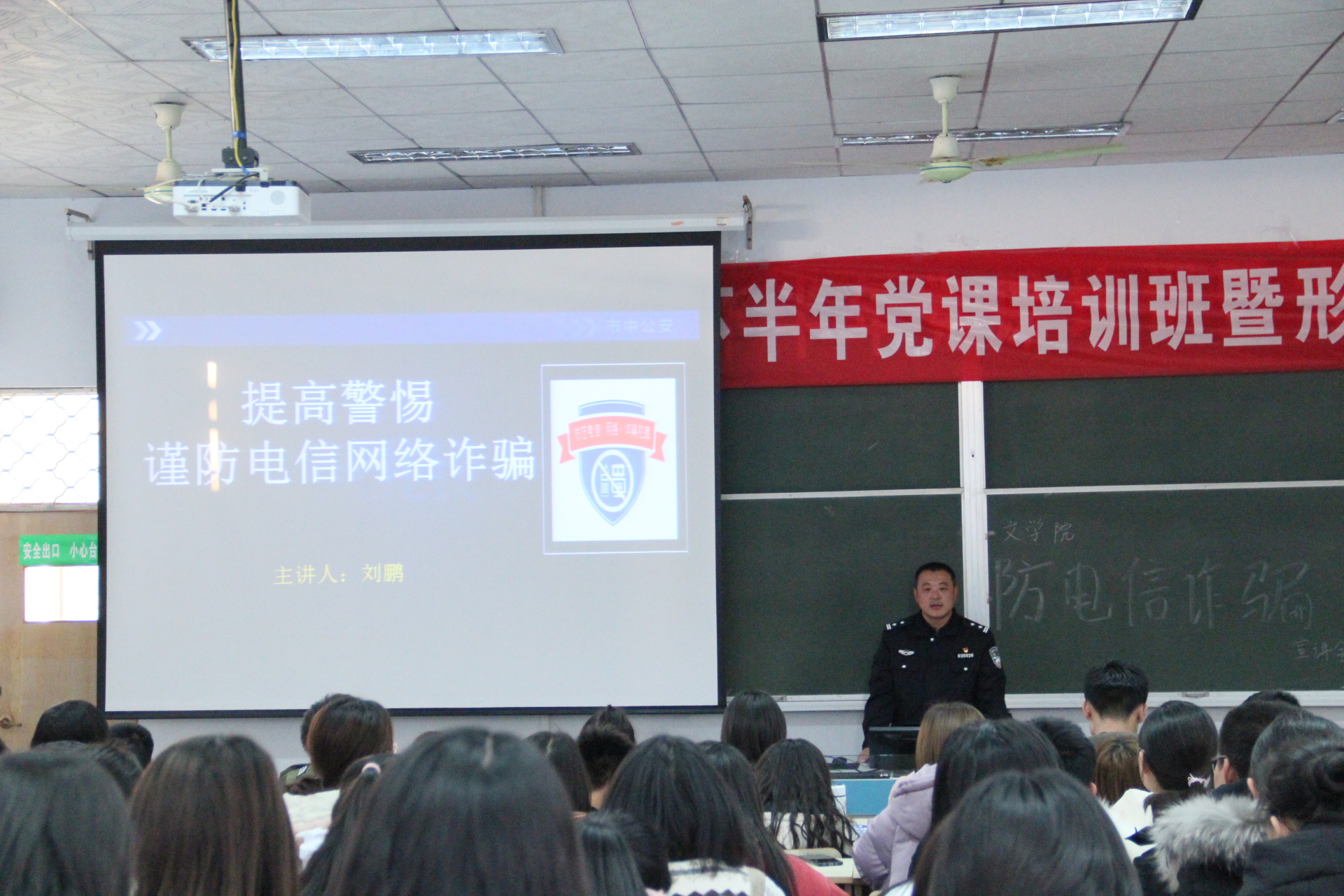 为使同学们熟悉生活中常见的诈骗形式,增强同学们的安全防范意识。beat365官方网站于12月4日在文科楼217教室举办防电信诈骗宣讲会。本次宣讲会由渴口派出所刘鹏警官主讲,18、19级部分学生到会聆听。