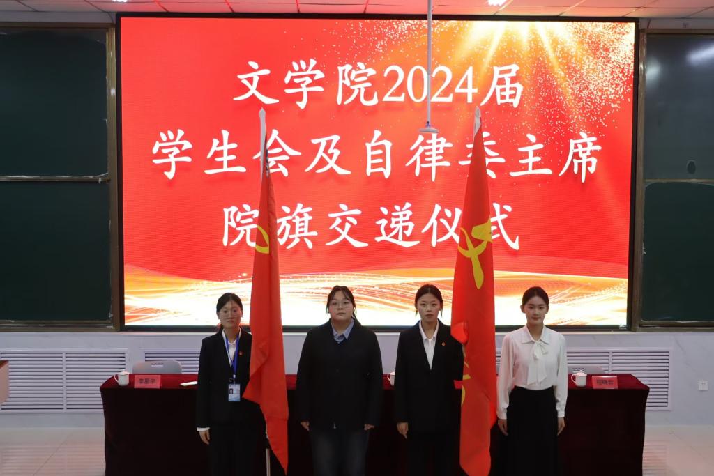 会上,杨晓雅、赵小倩分别宣读《beat365官方网站2024届学生会成员名单》和《beat365官方网站2024届自律委成员名单》,依次为新一届学生干部颁发聘书,2023届主席与新任主席进行院旗交接仪式,新任学生会、自律委主席团与各部部长进行挂牌,新任主席乔玥、马莹对过去的工作表示肯定,并强调之后在工作中会脚踏实地,锐意进取,再创文院佳绩。