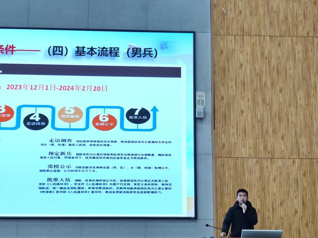 花英杰从大学生应征入伍政策和大学生参军入伍条件两个方面对参军入伍的要求进行详细的讲解,列举了国家对参军入伍大学生的各项优惠政策。朱硕、朱保逸、肖建超、滕鑫四位退役大学生士兵分享军营生活和感悟收获,他们结合自身入伍动机、军旅生活以及自我改变等方面,就同学们普遍关心的入伍准备、如何适应军营生活、复学后如何尽快回归大学校园进行讲解,鼓励大学生积极参与征兵活动。最后,宣讲人鼓励同学们主动接受选拔,从校园走进军营,用青春热血助力实现强国强军梦想。