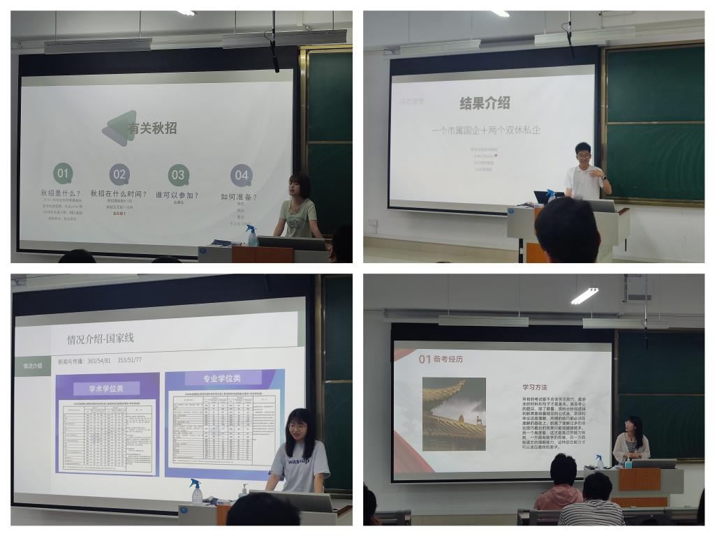 在求职经验分享环节中,赵红燕着重秋招求职方向,从求职前、求职中、求职后等三个方面进行了分享;杨士达着重春招求职方向,以自身参加校招和面试经历讲述了求职过程中需要注意的问题;郑彤彤着重考研备考方向,以考研各个阶段需要准备的事项为切入点为后辈们提供了一套完整的备考方案;王春美着重公务员求职方向,从打好基础、做好选择、实事求是等三个方面分享了自己选调和考公的经验。分享会之后,与会同学根据分享内容进行了热烈的讨论交流。