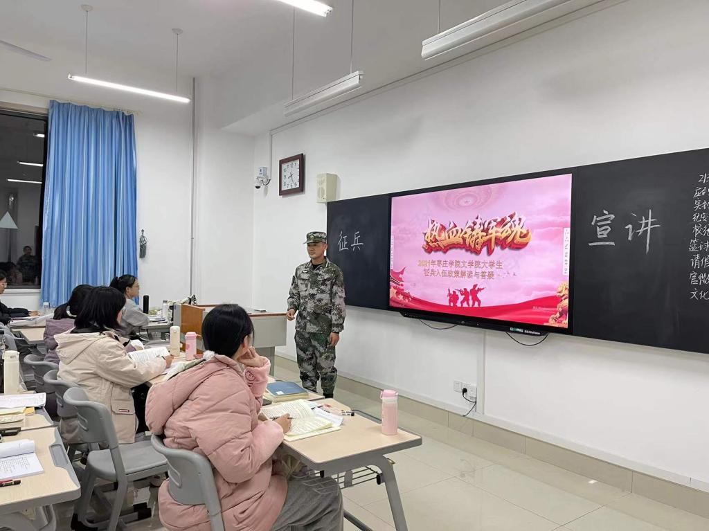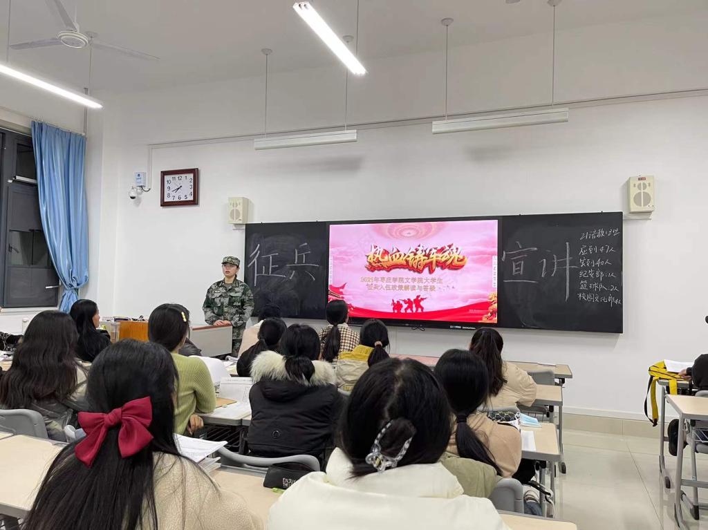 为贯彻落实强国强军思想,提升大学生国防意识,11月23日晚,beat365官方网站在各班进行参军入伍政策宣讲。此次宣讲由beat365官方网站退役大学生士兵、新校区教官卢萍、刘家名、赵阳和王华勇主讲,beat365官方网站21级全体学生到场参加。