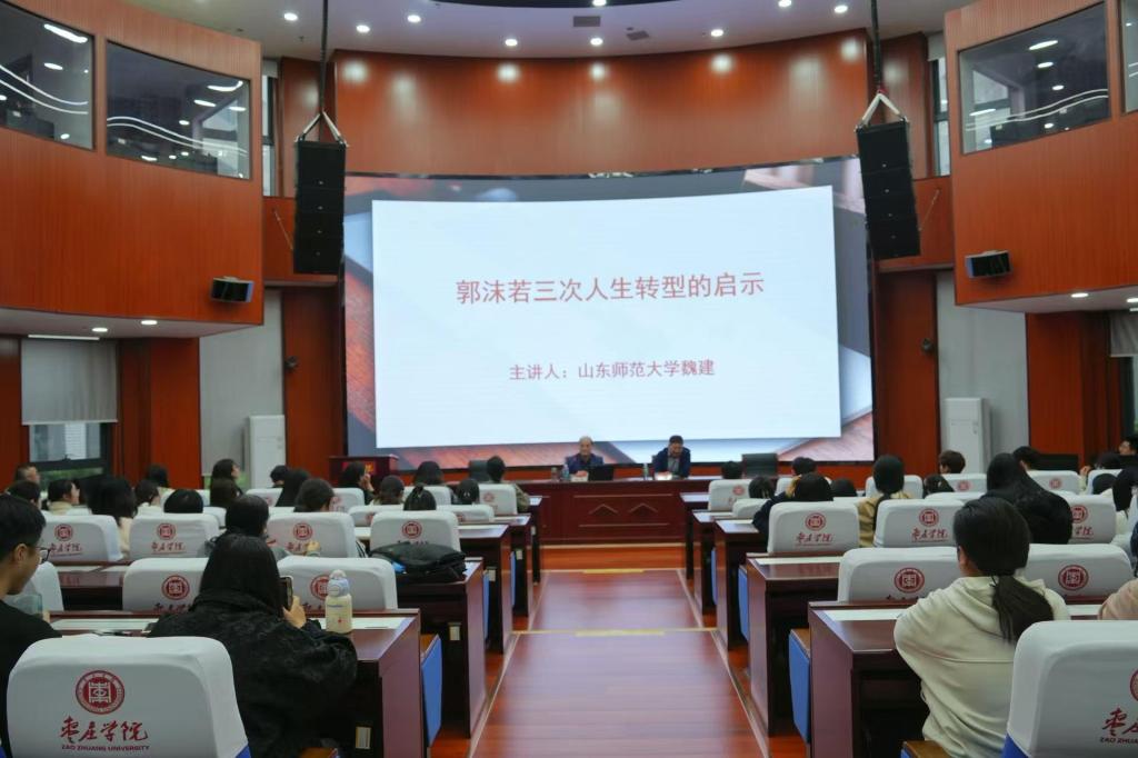 在下午的学术报告中,魏建教授以饱满的激情与深刻的洞察,引领在场师生回顾了郭沫若人生中三次关键转型:留学日本时学业濒临绝望的挣扎、步入社会后面对多重道路的抉择,以及流亡日本期间从人生低谷走向学术与创作高峰的蜕变。魏建教授坚持以史实为依据,对当前一些流于表面的学术认知予以了辨析与澄清。他倡导以“疑‘已知’、求‘未知’”的治学方法,深入历史现场,从中探寻杰出人物在命运转折关头的抉择智慧,为今人带来深刻启示。