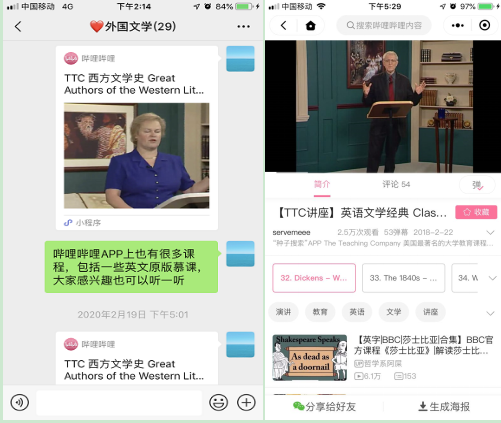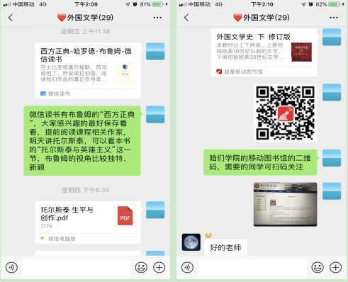 1.跟在校教学相似,在线教学教师不仅仅是课程知识的传授者,还应该成为优秀的策划者、设计者、组织者、监督者,这需要教师更多的付出。因为慕课的章节内容跟我们课程内容并不完全吻合,加上经调查得知学生们对慕课的视频课吸收效果不是很理想,所以我把慕课平台的异步spoc课程外国文学史(二)布置学生课前自己预习,课前通过班级课程微信群发给学生学习材料(课件、电子教材、论文、思考题等),推荐链接微信读书、超星图书馆等电子书、线上讲座(哔哩哔哩中一些英文原版讲座)等优质线上教育资源给学生,让学生结合慕课上已有的相关章节预习、自学,进行翻转课堂式教学