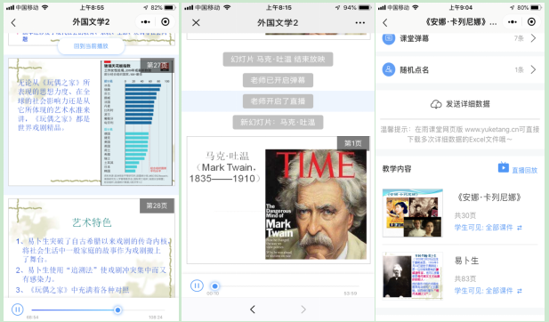因为疫情影响,在线开展教学五周以来,我利用我所导入、建设的中国慕课平台的spoc课程外国文学史(二)”(作为课下预习使用)、自己制作的精良课件在雨课堂(上周开始使用可以录屏的新版长江雨课堂腾讯会议、微信群等平台开展线上直播教学,微信读书、超星图书馆、哔哩哔哩上的优质英文原版慕课等优质线上教育资源作为辅助教学资源,效果良好。