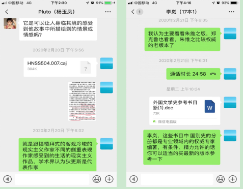 邹怡:疫情期间的网课体验,让我体会到了自主、自律学习的重要性。在外国文学网课中,老师非常用心地给我们教授新知识,推荐相关的书籍和视频给我们,让我受益匪浅,并且很多外国文学作品都可以找到电影,让我加深了对作品的兴趣和了解。通过雨课堂和腾讯会议的结合,我们也可以较好的学习。不过网课弊端就是较难观察大家的听课状态,难免会出现走神、控制不住自己的情况。还是希望早日回到课堂进行学习!