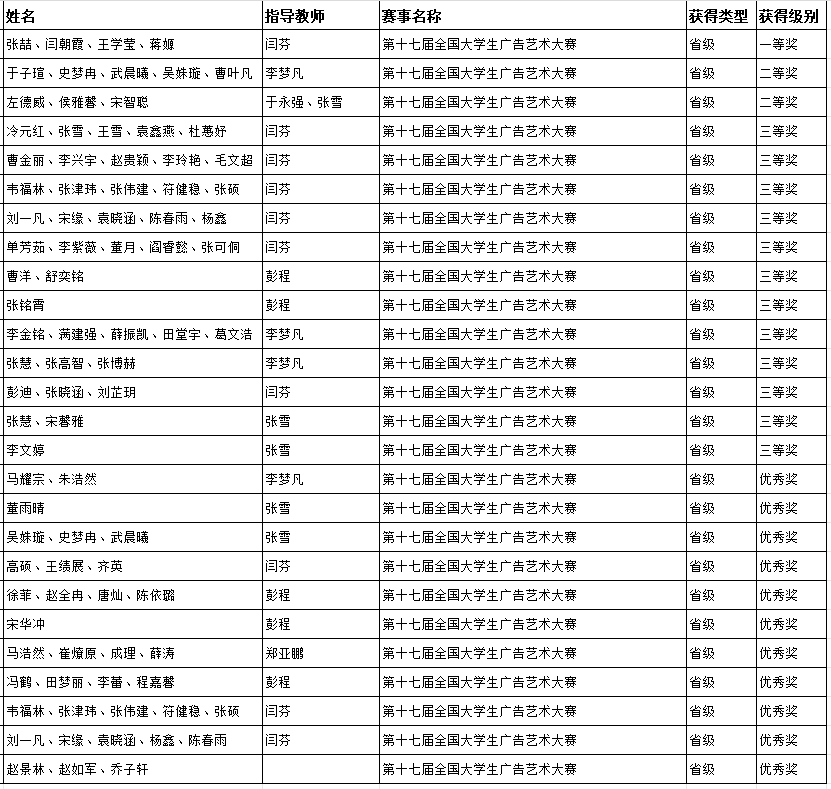 经过激烈角逐,我院学子喜获第17届全国大学生广告艺术大赛该赛事国赛三等奖1项、优秀奖2项,省赛一等奖1项、二等奖2项、三等奖12项、优秀奖11项。喜获第19届中国好创意暨全国数字艺术设计大赛国赛一等奖1项、三等奖1项,省赛二等奖1项、优秀奖2项。喜获第13届未来设计师・全国高校数字艺术设计大赛(NCDA)省赛三等奖1项。
