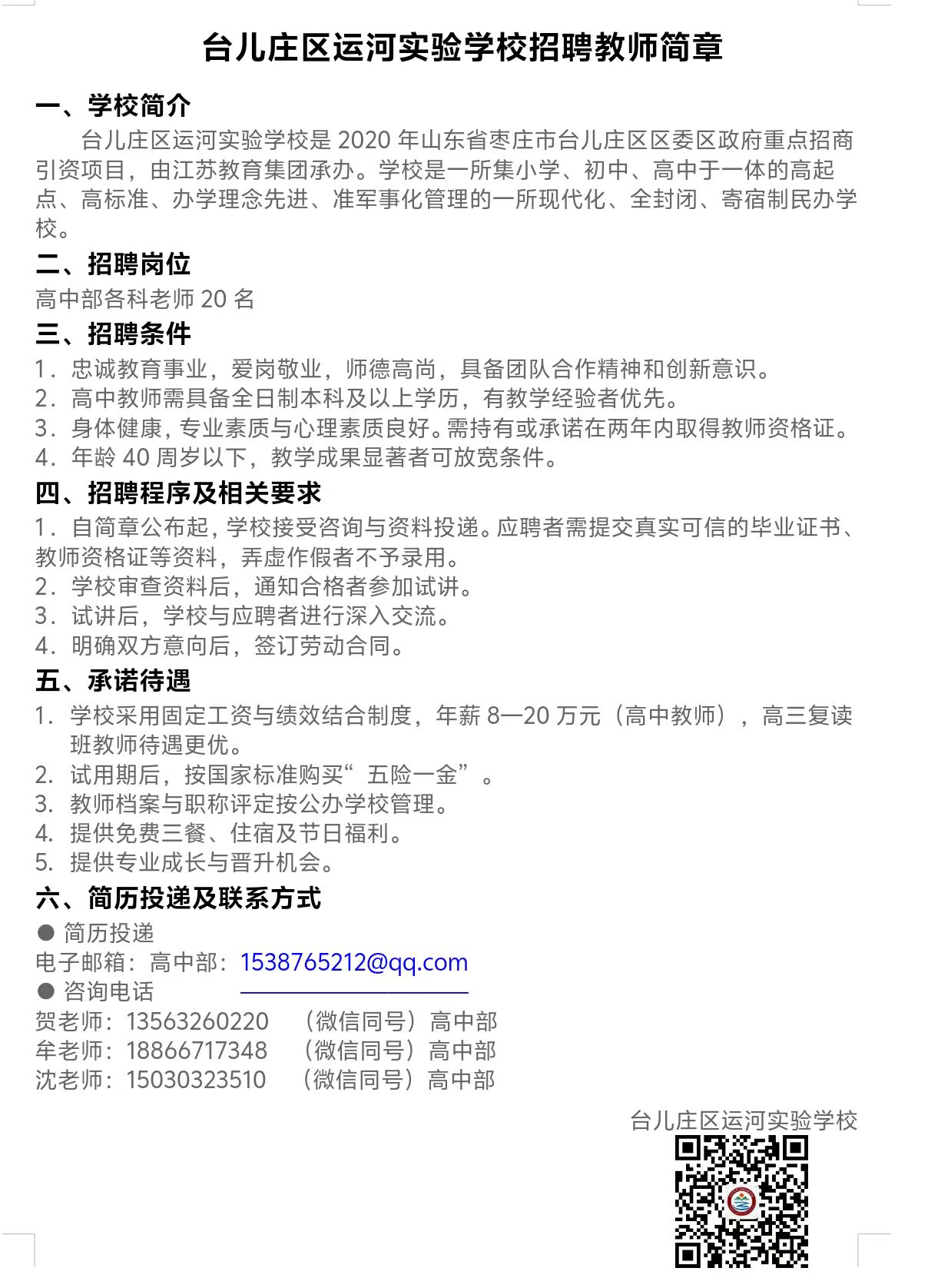 台儿庄区运河实验学校招聘教师简章