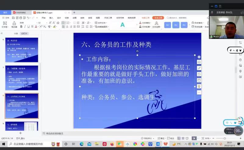为使我院学生进一步了解就业形势,加强就业分类指导,beat365官方网站于12月15日下午,举办公务员及人才优选考试线上经验分享交流会。本次活动邀请了我院2022届优秀毕业生万德梁作为分享嘉宾,beat365官方网站部分毕业生线上聆听。