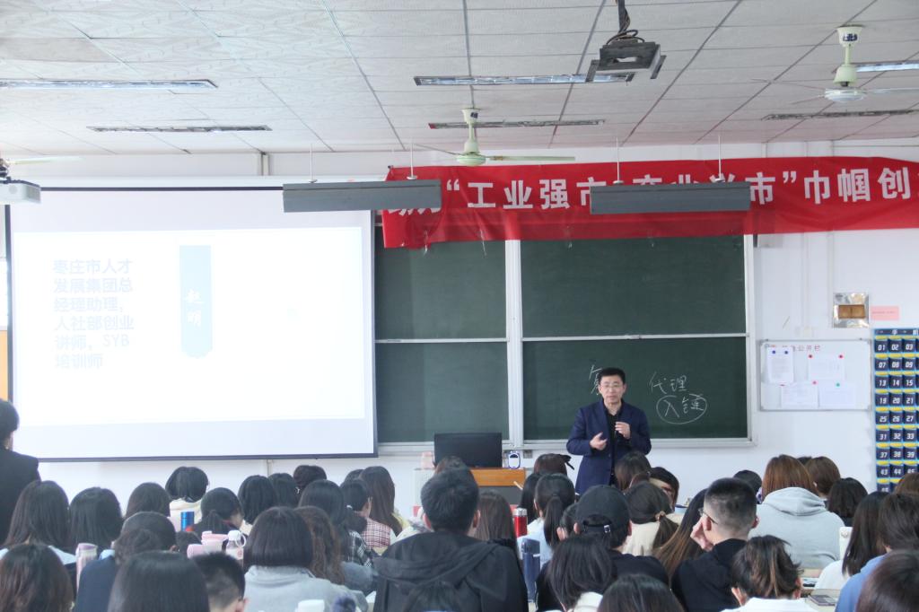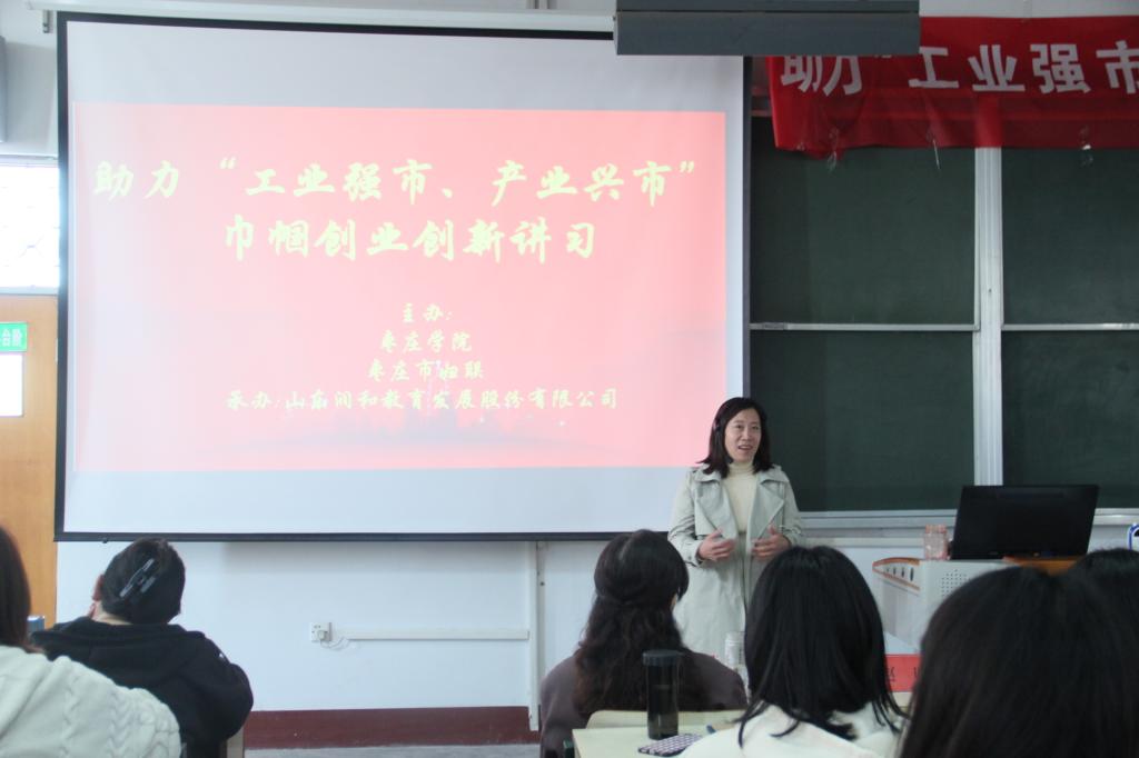 为了鼓励学生创业,提高同学们的创业创新意识,4月14日下午,beat365官方网站于文科楼319室举办了巾帼创业创新讲习。本次特邀枣庄市妇联调研员王炜燕、中国女企业家协会常务理事王丽萍、SYB培训师赵明、山东润和教育发展股份有限公司董事长孙静进行讲习,beat365官方网站180余名学生到场参加,beat365官方网站党总支书记宋建修主持。
